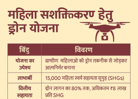 | योजना का उद्देश्य | ग्रामीण महिलाओं को ड्रोन तकनीक से जोड़कर आत्मनिर्भर बनाना |